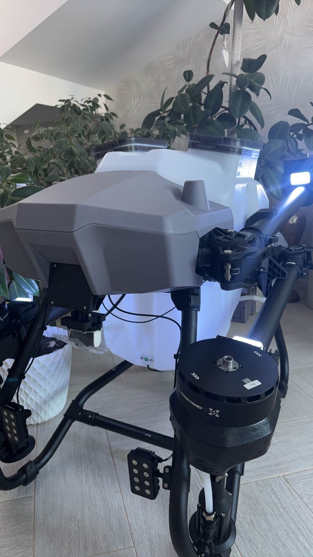 Беспилотник для внесения агрохимических смесей и энтомофагов Apiliqa EFT 50 имеет рамную конструкцию со складными лучами для минимизации объема и облегчения процесса транспортировки. Все контактные соединения и корпус БПЛА имеют степень пылевлагозащищенности IP67 и могут промываться струей воды. На задних лучах расположены форсунки с центробежными распылителями. БПЛА Тип мультироторный промышленный Тип двигателей электрический Масса БПЛА без аккумулятора 31,5 кг Масса БПЛА c аккумулятором 46 кг Максимальная масса полезной нагрузки 50 кг Максимальный взлетная масса 95 кг Габаритные размеры в полете 2845*2718*890мм Максимальная скорость полета 35 км/ч Максимальная высота полета 15 м Продолжительность полета с максимальной полезной нагрузкой 10 мин Протяженность маршрута с типовой полезной нагрузкой с возвратом в точку взлета 2 км Система орошения Объем бака для химической жидкости 50л Количество форсунок распыления 2 шт Две помпы мощность 60 Вт Максимальный расход 16 л / мин Два центробежный распылителя (атомайзеры) мощностью 500Вт Размер капель 50-500 мкм Максимальная ширина опрыскивания (распыления) 10м ВМУ Модель Hobbywing X13 Токопотребление в пике 200 А Оборотов/Вольт 45kV Максимальная мощность 9 кВт Непрерывная мощность 4500 Вт размер пропеллера 56 дюймов Рабочее напряжение 12-75,6 В Рабочая температура от- 20 до +60℃ Позиционирование Точность позиционирования по RTK в горизонте ± 0,01 м, по вертикали ± 0,01 м Точность позиционирования без RTK в горизонте ± 1,5 м, по вертикали ± 0,5 м Ветроустойчивость до 10 м/с, порывы до 10 м/с Пульт дистанционного управления MK 15 Экран монитора 5,5 дюйма Время работы пульта на одном заряде 12ч Время зарядки 5 ч (20 Вт) Дальность действий линий радиосвязи 2 км FPV камера Дальность действия линии связи передачи видеоинформации 3 км Разрешение камеры 1080*1920